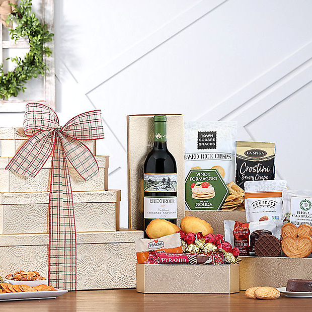 This exquisite gift tower is filled with a collection of the most requested Wine Country gourmet snacks and Edenbrook fruity cabernet sauvignon. Complementary items include mixed olives, Rovelli milk and dark chocolate with hazelnut pralines, crackers, Vine e Formaggio smoked Gouda cheese spread, Feridies honey roasted peanuts and more.