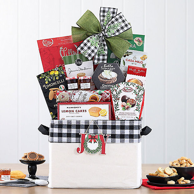 Bring a little joy to every moment with this Sweet and Savory Assortment of Joy basket, beautifully finished with a festive Joy hang tag. Inside, your recipient will discover Bella Formaggio smoked Gouda cheese spread, lemon cakes, Lille chocolate cookie thins, Rovelli dark chocolate with hazelnut pralines, Shell Bella madeleine cake, Bonne Maman apricot and strawberry preserves, Panearte Limoncelli cookies and more. Beautifully arranged and ready to gift, this joyful basket is designed to brighten anyone’s day.