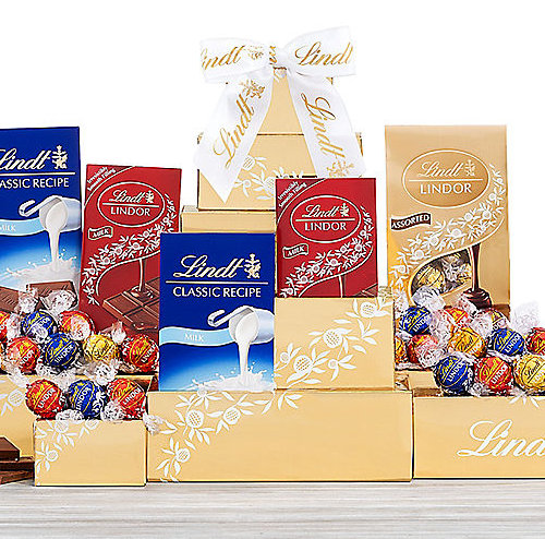 This exclusive gift tower from Lindt, master Swiss chocolatier since 1845, is filled with an assortment of iconic chocolate. Milk chocolate truffle and classic milk chocolate bars are paired with a complete collection of more than forty Lindt Lindor truffles including milk chocolate, white chocolate, dark chocolate, double milk chocolate and milk chocolate caramel to create this Lindt chocolate gift tower.