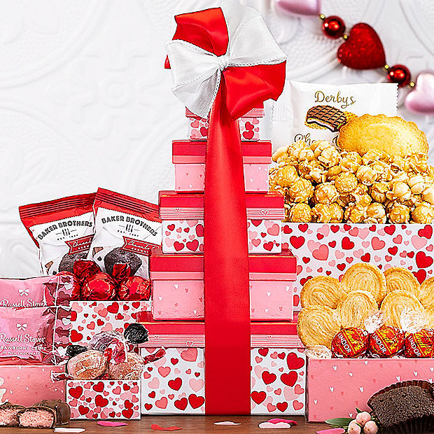 Five red and pink boxes decorated with hearts and stacked in a tower arrive with an assortment of Valentine’s Day favorites. Lindt Lindor milk chocolate truffles, chocolate chip brownies, Italian dark chocolate hazelnut pralines, a madeleine cake, palmiers cookies, milk chocolate strawberry cremes, raspberry and blackberry fruit jelly candy, caramel corn and a chocolate strawberry waffle cookie fill this delightful Valentine tower, finished with a matching red satin ribbon and bow.