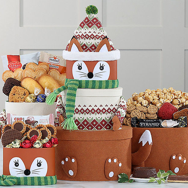 This happy little fellow comes bearing gifts. Each of his three round boxes contains a sumptuous surprise. A bounty of Lindt Lindor milk and dark chocolate truffle balls, Grona puff pastries, Rovelli dark and milk chocolates with hazelnut, brown butter kettle corn popcorn, chocolate sauce souffle cake more are just some holiday favorites. The adorable fox makes a great winter decoration once all the goodies have been enjoyed.